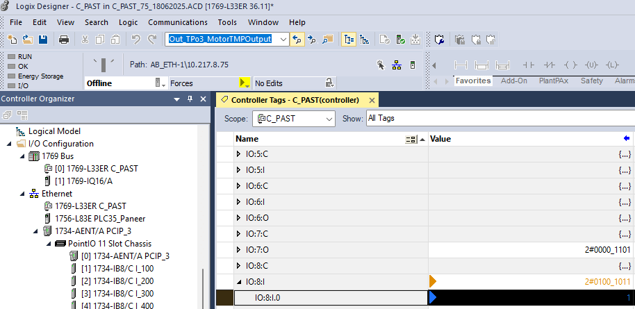 • Access Controller Tags: In Studio 5000, open your project, go to the Controller Organizer, and select “Controller Tags.” Locate the I/O tag (e.g., Local:1:I.Data for inputs or Local:1:O.Data for outputs).