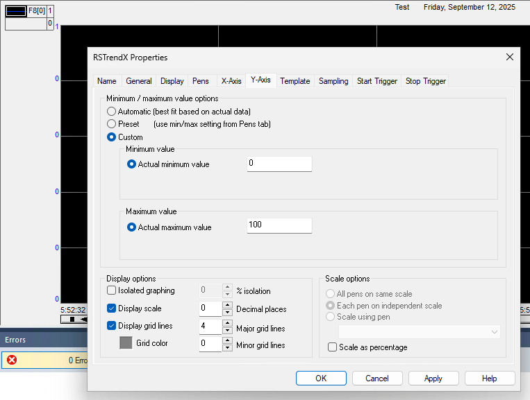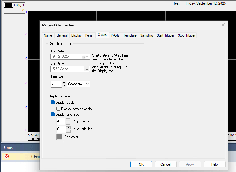 • Configure Chart Settings: Right-click the Trend window, select “Chart Properties,” and adjust the X-axis (time span, e.g., 2 minutes) and Y-axis (value range, e.g., 0–100). Disable auto-scaling for clarity.