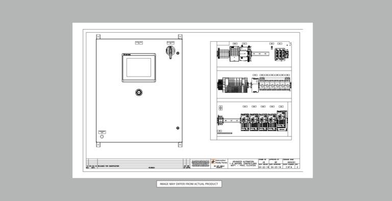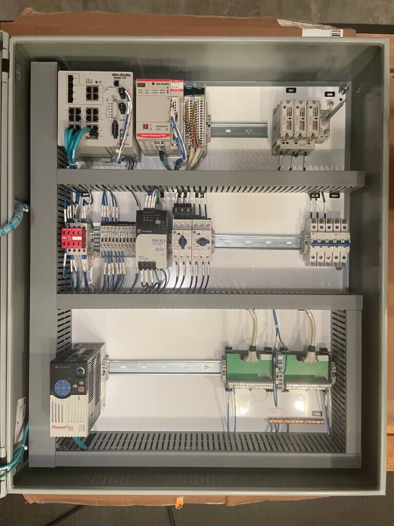 With this control panel, the CompactLogix 5380 PLC can be programmed flexibly with many logic options and HMI with features and settings for operational flexibility.  Automation Ready Panels pre-programs this system with Discrete Input Delay (On/Off Timers) programming blocks to keep inputs from flutter or can be used for delay timers on levels, photoeyes, or other sensors. Analog Scaling programming blocks are used for analog inputs/outputs.  Motor, VFD, and devices programming blocks are included with feature rich functionality (Rockwell Machine Builder Library V12 and Power Device Library V2.2).  Statistical Analysis programming blocks can be used for average and standard deviation calcs for a sample size.  VFDs are networked over Ethernet/IP to reduce IO requirements and bring in smart data from the device.  Other communications types to Micro800 PLCs and SMC valve banks are included.  A full state machine, shell sequencer programs, and a safety program have been added to reduce final integration time.  The HMI has pre-designed graphics for OEE production data (current and previous shift), Cycle Timer, Production Rate, Recipe Status, State Machine and Sequencer Status, Alarming and Alarm Management, VFD control status and faults popup, Valve and device control and status popups, settings input boxes, motor valve analog discrete device objects with breadcrumbs, historical trending, user security, recipe management, PDF Viewer with manuals and electrical drawings embedded in the HMI, Cycle Reports, Preventive Maintenance Report, Emailing Reports, and Batch Tracking.  If desired, one of Automation Ready Panels controls engineers can program up to one hour of free programming (**) to finish off your sequencer, meeting your applications needs.  This means that a fully functional controls system can be delivered and ready to install, wire sensors and motors, power up, and the system is up and running.