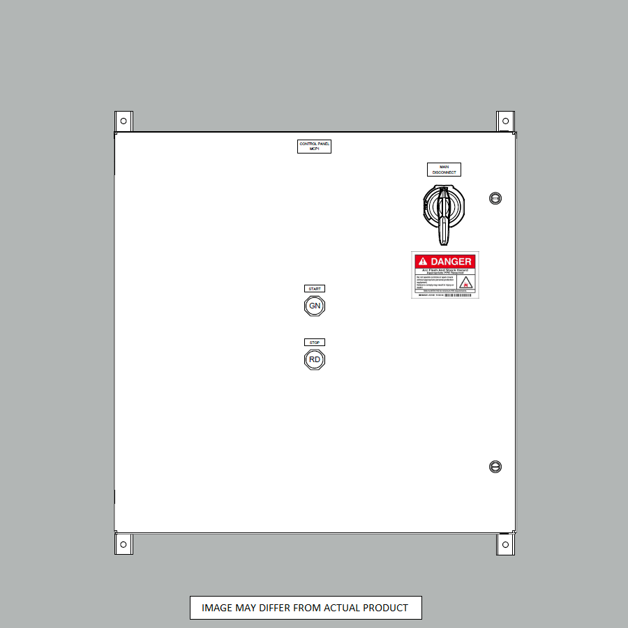 (*) Up to 3 Motor Starters or VFDs can be used in this design with a Full-Load Amps of less than 200 Amps (Due to our 200 Amp Max Disconnect Limitation: largest motor amps x 1.25 + sum of other motor amps + non-motor continuous loads x 1.25).  Visit https://www.engineeringtoolbox.com/elctrical-motor-full-load-current-d_1499.html for motor FLA chart.  Panel Size may be larger than shown if large VFDs are selected (May also include fan/filter kit if VFDs are selected).  Temperature calculation assumes only back of panel has no air flow, Indoor Use (out of direct sunlight), 50-90°F Ambient temperature.