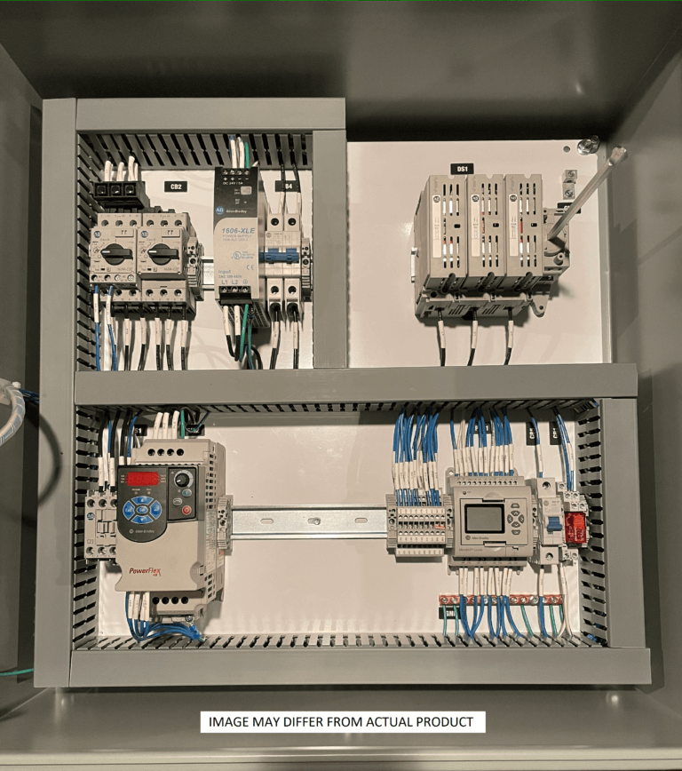This Simple Automation Panel is based around a small micro PLC, FVNR Motor Starters, and/or Powerflex 4M Variable Frequency Drives (*).  With this control panel, the PLC can be programmed flexibly with many logic options.  Automation Ready Panels pre-programs this system with Discrete Input Debounce (On/Off Timers) programming blocks to keep inputs from flutter or can be used for delay timers on levels, photoeyes, or other sensors.  A pilot light is embedded in the green start pushbutton and programmed to flash with a pattern for system status or other indications.  A shell sequencer program has been added to reduce final integration time.  If desired, one of Automation Ready Panels controls engineers can program up to one hour of free programming (**) to finish off your sequencer, meeting your applications needs.  This means that a fully functional controls system can be delivered and ready to install, wire sensors and motors, power up, and the system is up and running.