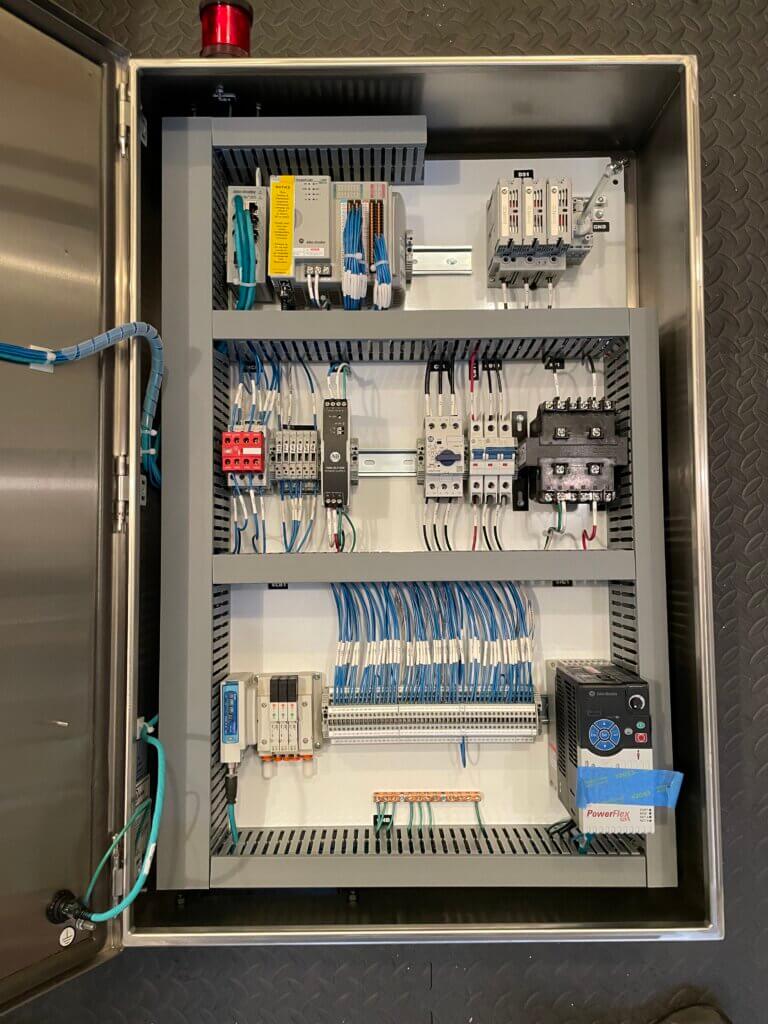 With this control panel, the ControlLogix 5580 PLC can be programmed flexibly with many logic options and HMI with features and settings for operational flexibility. Automation Ready Panels pre-programs this system with Discrete Input Delay (On/Off Timers) programming blocks to keep inputs from flutter or can be used for delay timers on levels, photoeyes, or other sensors. Analog Scaling programming blocks are used for analog inputs/outputs. Motor, VFD, and devices programming blocks are included with feature rich functionality (Rockwell Machine Builder Library V12 and Power Device Library V2.2). Statistical Analysis programming blocks can be used for average and standard deviation calcs for a sample size. VFDs are networked over Ethernet/IP to reduce IO requirements and bring in smart data from the device. Other communications types to Micro800 PLCs, CompactLogix PLCs, Micrologix PLCs, Fanuc Robots, and SMC valve banks are included. A full state machine, shell sequencer programs, and a safety program have been added to reduce final integration time. The HMI has pre-designed graphics for OEE production data (current and previous shift), Cycle Timer, Production Rate, Recipe Status, State Machine and Sequencer Status, Alarming and Alarm Management, VFD control status and faults popup, Valve and device control and status popups, settings input boxes, motor valve analog discrete device objects with breadcrumbs, historical trending, user security, recipe management, PDF Viewer with manuals and electrical drawings embedded in the HMI, Process Reports, Preventive Maintenance Report, Emailing Reports, and Batch Tracking. If desired, one of Automation Ready Panels controls engineers can program up to one hour of free programming (**) to finish off your sequencer, meeting your applications needs. This means that a fully functional controls system can be delivered and ready to install, wire sensors and motors, power up, and the system is up and running.