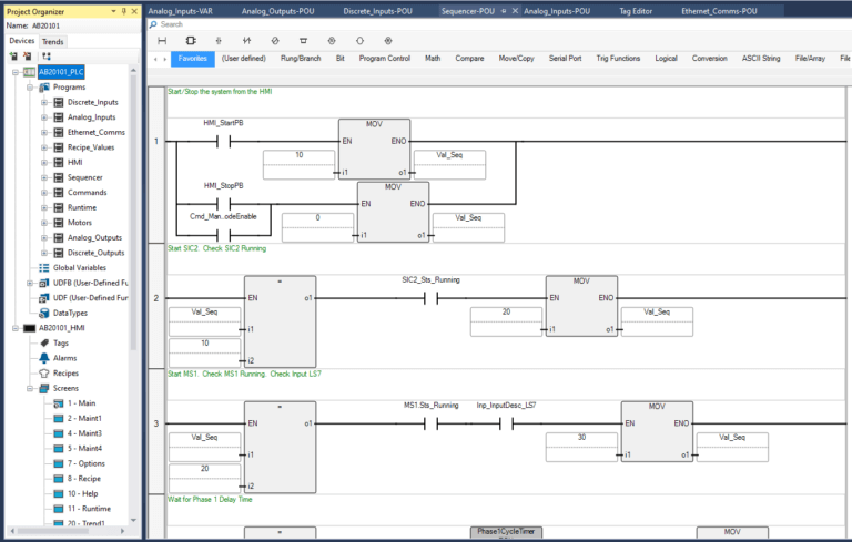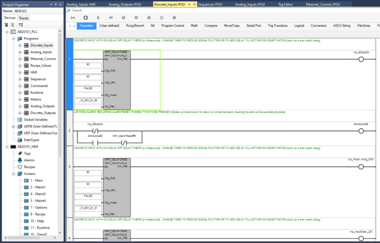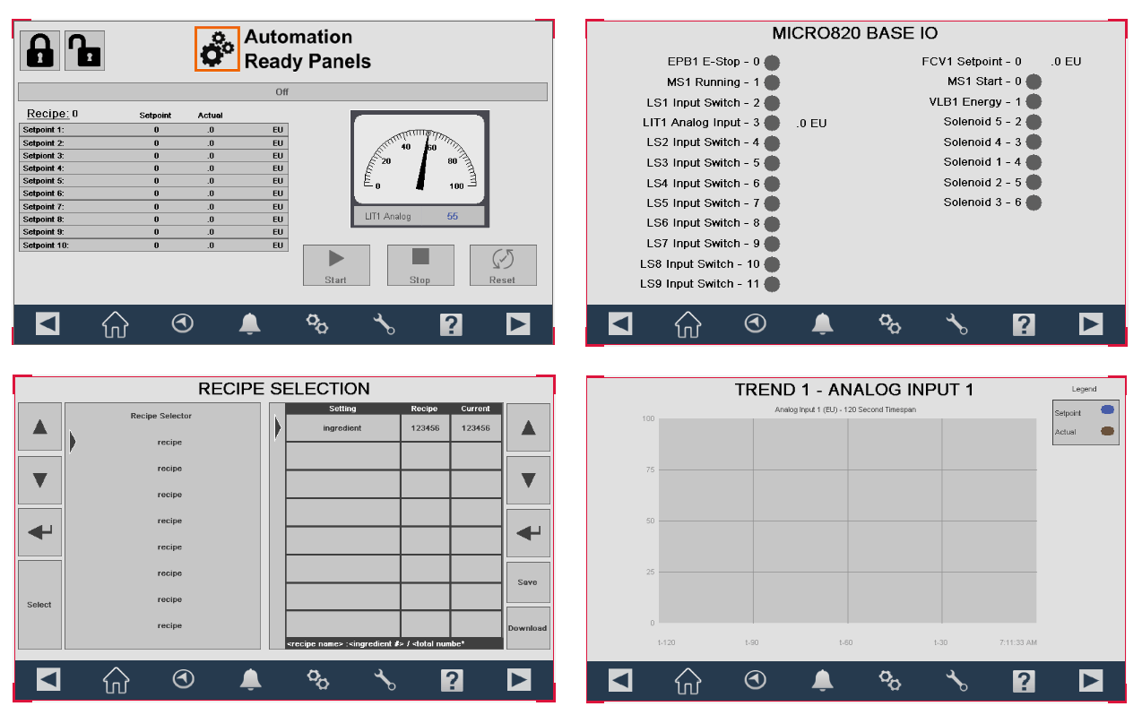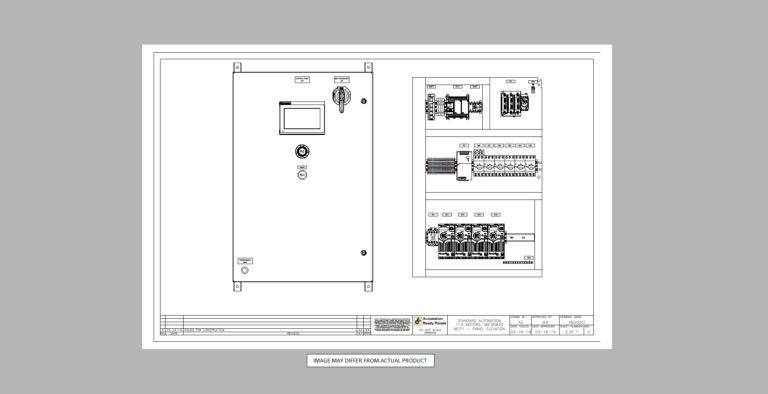 This Standard Automation Panel is based around a small micro PLC, Color/Touch HMI, FVNR Motor Starters and/or Powerflex 523 Variable Frequency Drives (*). With this control panel, the PLC can be programmed flexibly with many logic options and HMI with features and settings for operational flexibility. Automation Ready Panels pre-programs this system with Discrete Input Debounce (On/Off Timers) programming blocks to keep inputs from flutter or can be used for delay timers on levels, photoeyes, or other sensors. Motor and VFD programming blocks are included with feature rich functionality. VFDs are networked over modbus to reduce IO requirements and bring in smart data from the device. A shell sequencer program has been added to reduce final integration time. The HMI has pre-designed graphics for IO status, VFD status and faults, settings input boxes, maintenance mode and manual start stop of motors, trends, user security, recipe management, and alarm summary. If desired, one of Automation Ready Panels controls engineers can program up to one hour of free programming (**) to finish off your sequencer, meeting your applications needs. This means that a fully functional controls system can be delivered and ready to install, wire sensors and motors, power up, and the system is up and running.