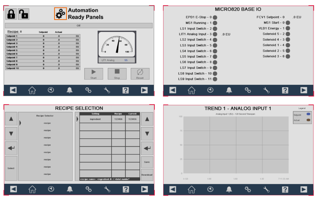 This Standard Automation Panel is based around a small micro PLC, Color/Touch HMI. With this control panel, the PLC can be programmed flexibly with many logic options and HMI with features and settings for operational flexibility. Automation Ready Panels pre-programs this system with Discrete Input Debounce (On/Off Timers) programming blocks to keep inputs from flutter or can be used for delay timers on levels, photoeyes, or other sensors. Motor and VFD programming blocks are included with feature rich functionality. VFDs are programmed using modbus to reduce IO requirements and bring in smart data from the device. A shell sequencer program has been added to reduce final integration time. The HMI has pre-designed graphics for IO status, VFD status and faults, settings input boxes, maintenance mode and manual start stop of motors, trends, user security, recipe management, and alarm summary. If desired, one of Automation Ready Panels controls engineers can program up to one hour of free programming (**) to finish off your sequencer, meeting your applications needs. This means that a fully functional controls system can be delivered and ready to install, wire sensors and motors, power up, and the system is up and running.